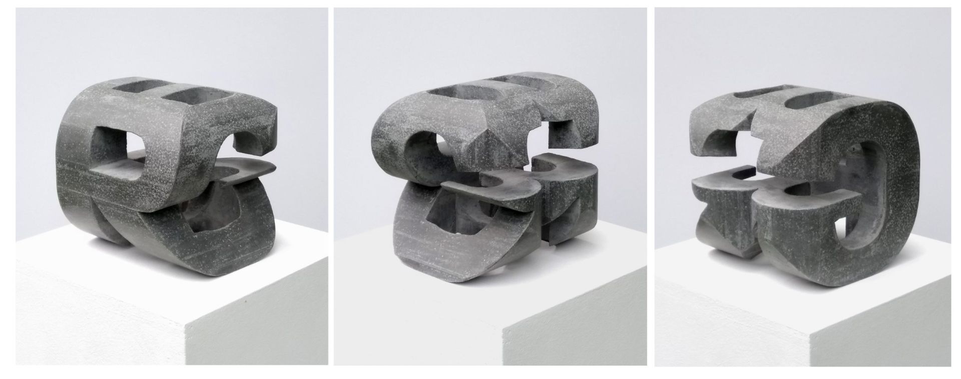 The sculptures are cast concrete artworks formed from the initials of the additive colors: red, green, and blue. The two sculptures are closely interconnected. In the case of the smaller sculpture, the initials of the three colors morph into each other. In the larger sculpture, the previous small form's absences create space, revealing one of the genre-specific features of concrete sculpture, the negative form, the shuttering, which is often unseen. The artist regards the RGB sculptures as a foundational point, catalyzing a deliberate and increasingly intense exploration of coloration within his artistic works.